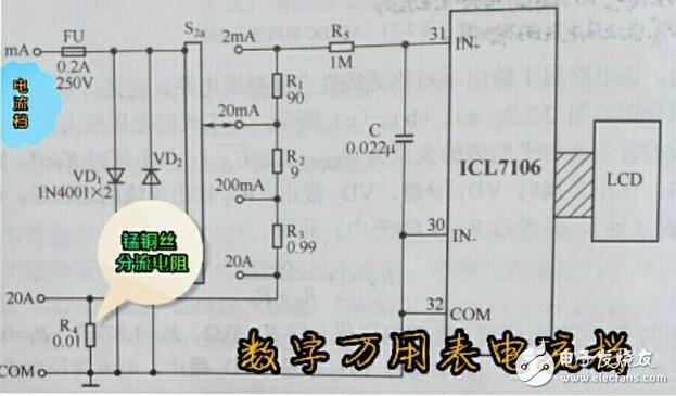L'image ci-dessus est le schéma de circuit de l'engrenage à courant continu du multimètre numérique. Dans la figure, R1 ~ R3 sont les résistances shunt de l'engrenage mA et R4 est la résistance shunt de l'engrenage de courant 20A. Étant donné que le courant de mesure du fichier mA est faible (maximum 200 mA), les résistances à film métallique de précision R1 ~ R3 sont suffisantes. Le courant maximal circulant dans R4 de la plage de courant de 20 A peut atteindre 20 A et sa valeur de résistance n'est que de 10 mΩ. Dans le même temps, le coefficient de température de la résistance doit également être extrêmement faible (des dizaines de ppm ou moins), de sorte que les résistances à film métallique ordinaires ne sont pas compétentes. R4 adopte généralement une résistance de fil de cuivre au manganèse avec une haute précision, un faible coefficient de température (40 ppm) et une bonne stabilité. Cependant, la résistance à l'oxydation de ce fil de cuivre au manganèse n'est pas aussi bonne que celle du fil de constantan. (La différence entre le fil de cuivre au manganèse et le fil de constantan est : le premier est en cuivre et le second est en blanc argenté).